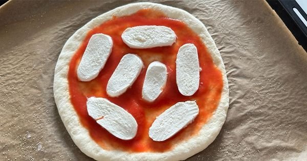 4. 1 kutu konserve domatesi kaseye alın. 6-7 yaprak fesleğeni elinizle koparıp içine ekleyin. Üzerine 1 silme tatlı kaşığı tuz ve 1 yemek kaşığı sızma zeytinyağı ilave edin. Domatesleri elinizle ezerek karıştırın. Domates sosunu ince bir tabaka halinde yayın. Üzerine didiklenmiş mozzarella serpin.