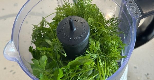 Renkli pilavın yeşil katmanı için parçalayıcıya 7-8 dal dereotu ve 7-8 dal maydanozu alın, püre kıvamına gelene kadar çekin. Hazırladığınız yeşillikleri bir karıştırma kabına aktarın.